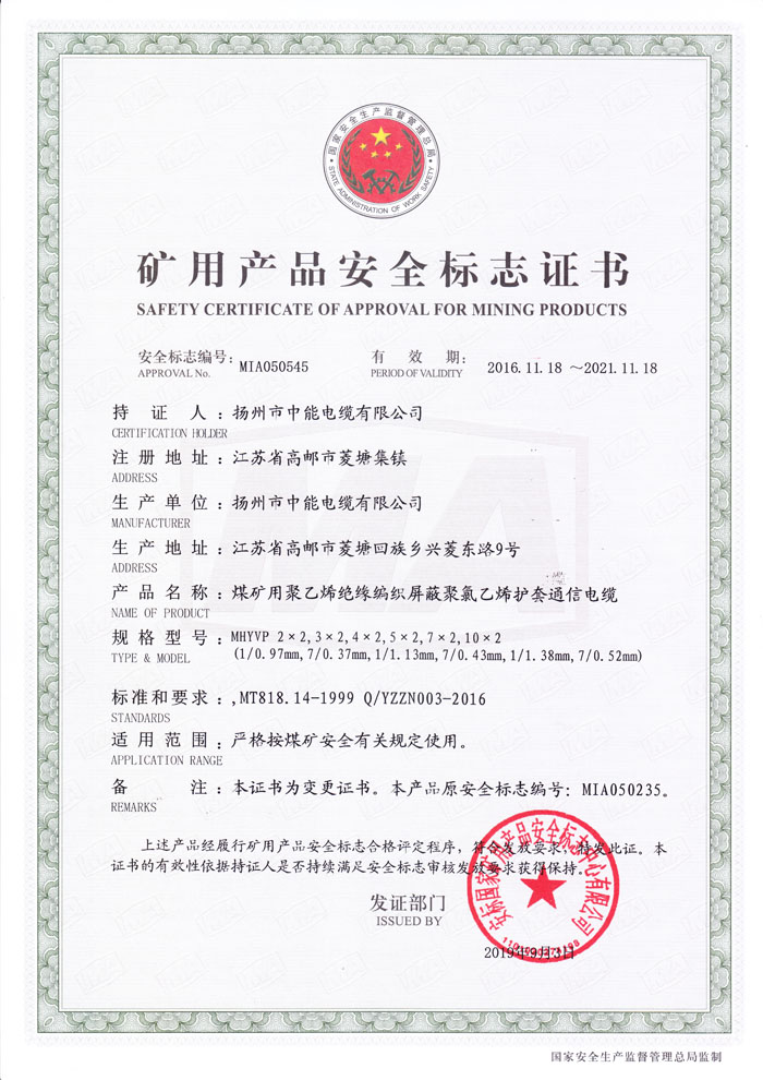 礦用產(chǎn)品安全標(biāo)志證書MHYVP 2×2,3×2,4×2,5×2,7×2,10×2 (1/0.97mm,7/0.37mm,1/1.13mm,7/0.43mm,1/1.38mm, 7/0.52mm)