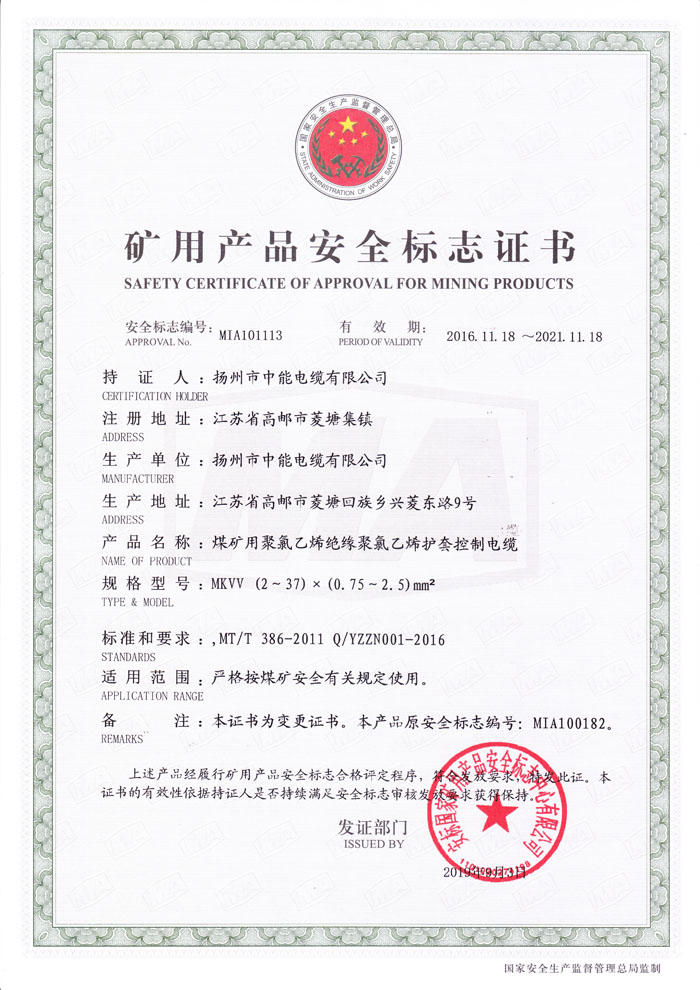 礦用產(chǎn)品安全標(biāo)志證書MKVV-450/750 (2~37)×(0.75~2.5)mm2
